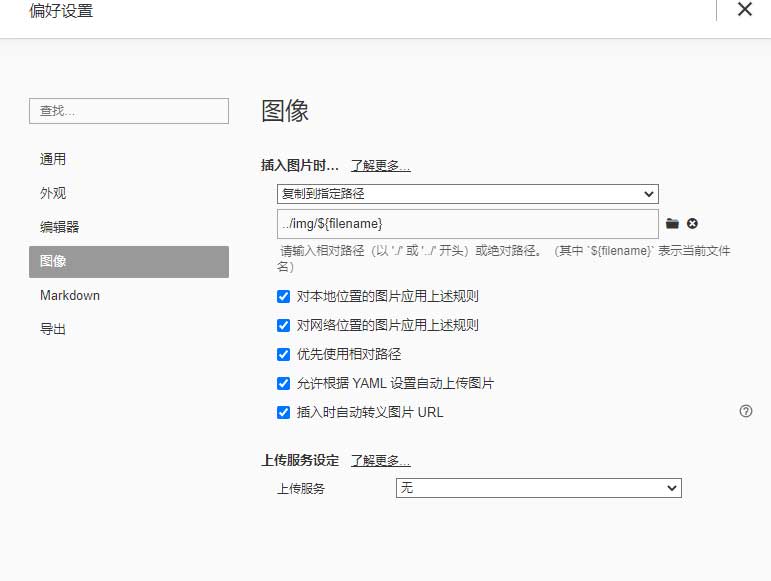 1 2 3 4 5 6 7 8复制到制定路径 ../img/${filename} 勾选所有选项: 对本地位置的图片应用上述规则 对网络位置的图片应用上述规则 优先使用相对路径 允许根据YAML设置自动上传图片 插入时自动转义图片URL这样的话所有插入到md的图片都将会保存到