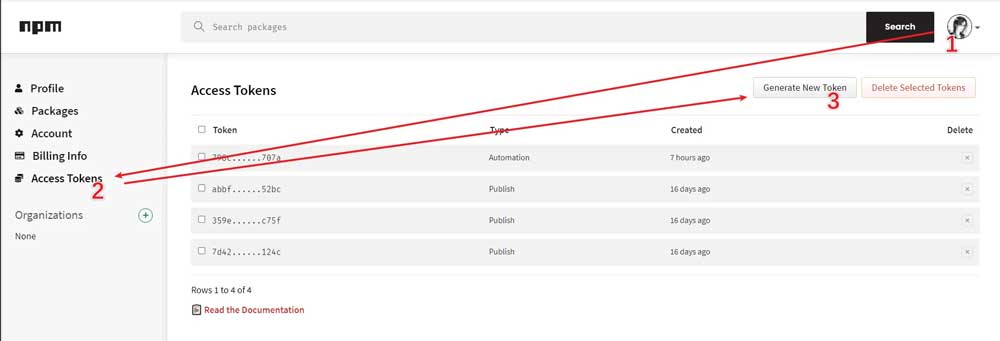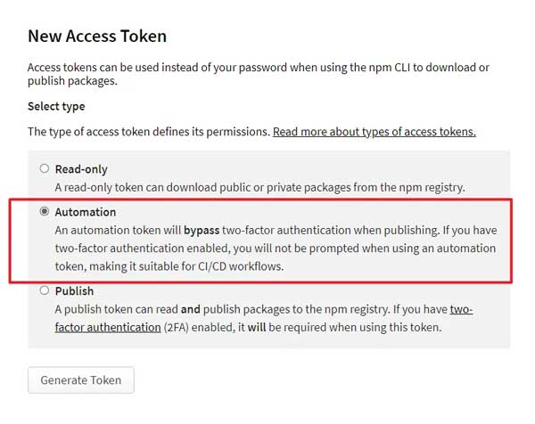 在 npm 官网 ->头像 ->Access Tokens->Generate New Token, 勾选Automation选项,Token 只会显示这一次,之后如果忘记了就只能重新生成重新配置了。